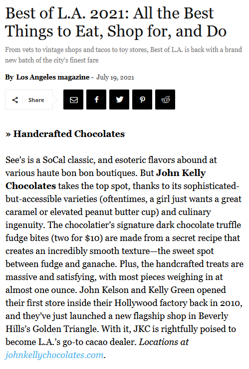 “My wife has a soft spot for chocolate, and there’s an exquisite chocolatier off Sunset called John Kelly Chocolates. I don’t love chocolate, but I love theirs.”